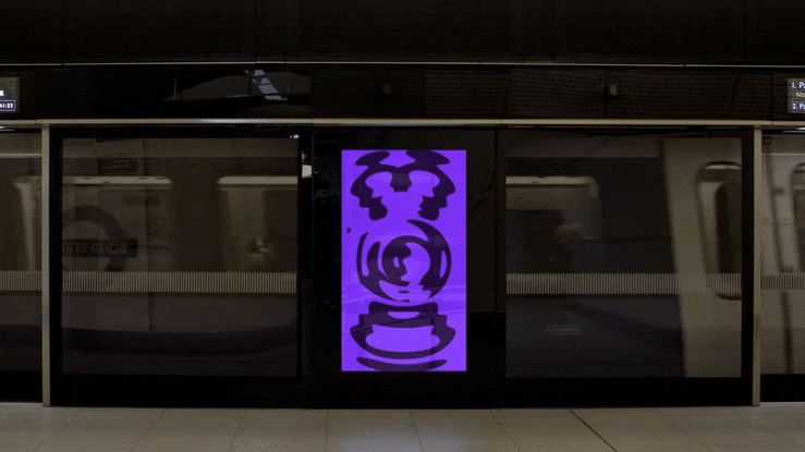 Portrait digital screen with walking people and moving train